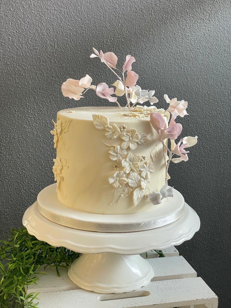 An ivory textured, marbled cake, with blossoms and leaves, and piped brush embroidery. Decorated with lilac sweet peas and hydrangeas.