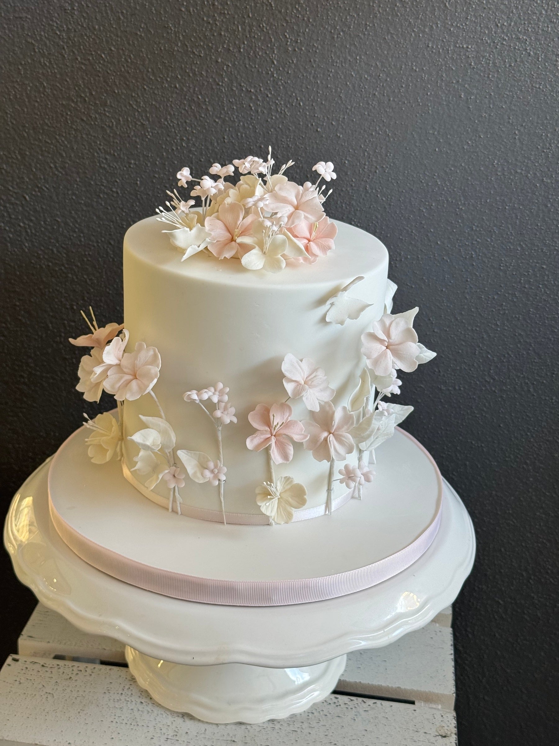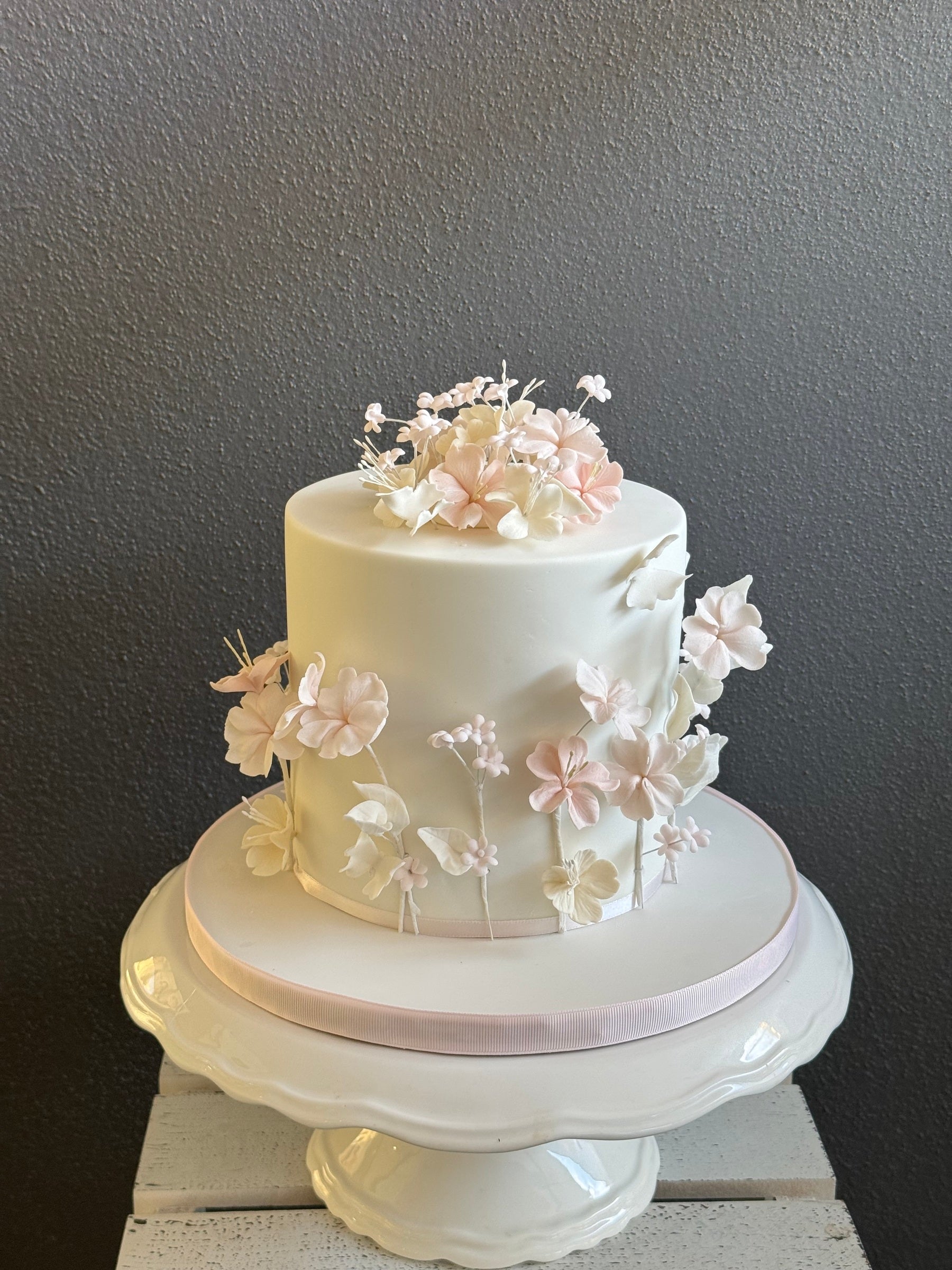 This a pretty pink and white cake, decorated with pink and white blossoms and leaves.