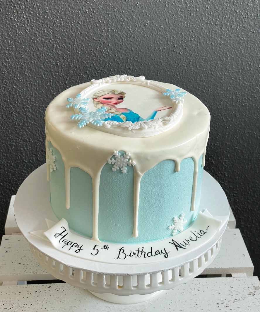 Elsa edible image in an edible white snowflake photo frame. We decorate this cake with a white chocolate drip, and snowflakes. Also available as Anna and Elsa in one frame together.