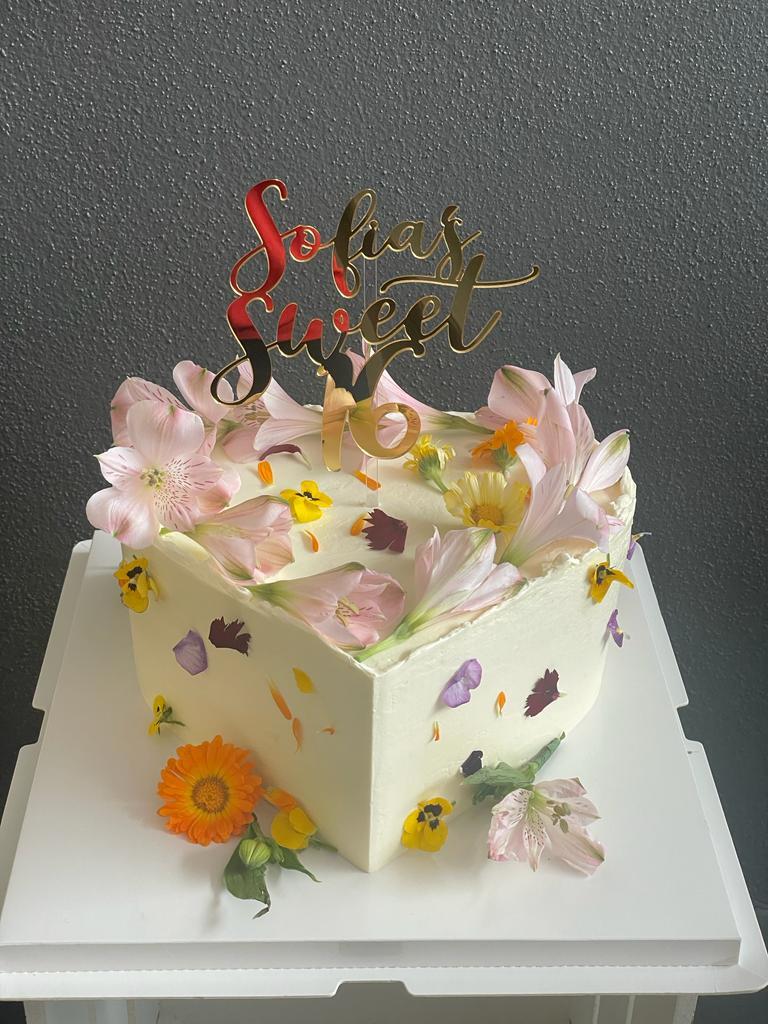 A heart shaped cake, decorated with edible flowers and petals, and fresh Alstroemetria flowers (non-edible).