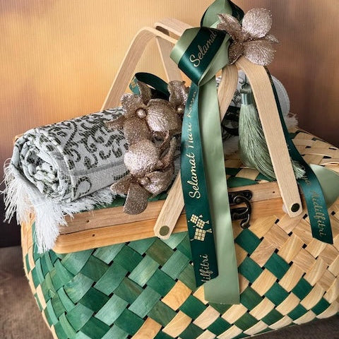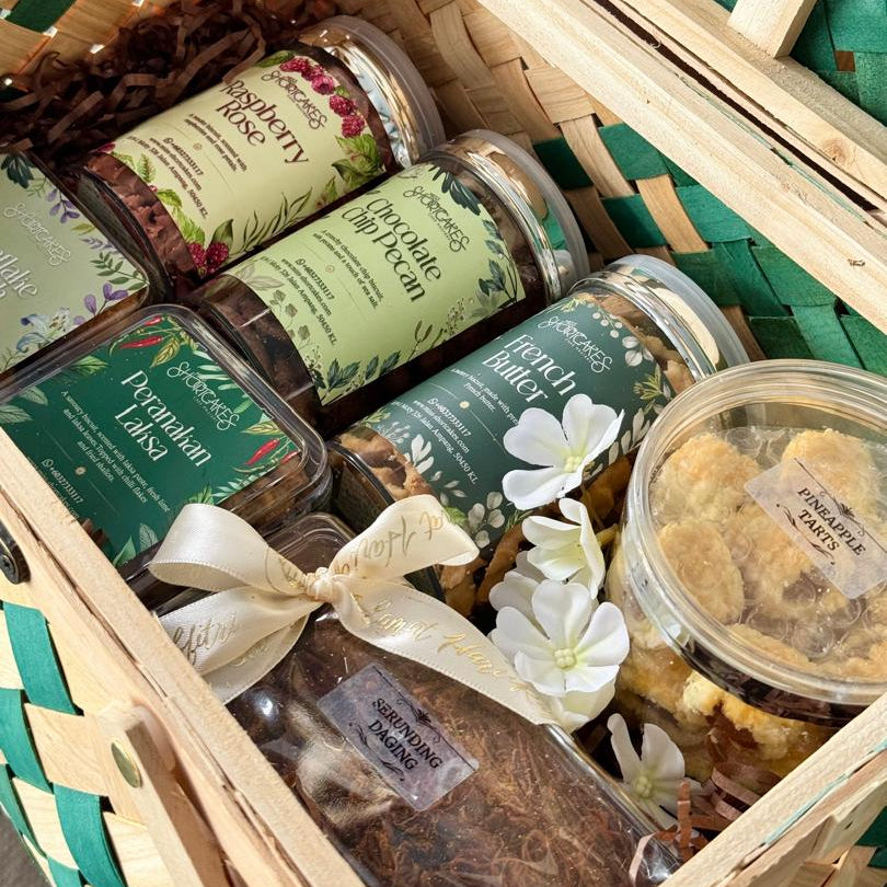 An elegant expression of Raya warmth and tradition, our Anyaman Mahkota Hamper is crowned with a beautifully folded sejadah, symbolising blessings, gratitude, and togetherness. Nestled within the woven basket, discover a thoughtfully curated selection of our festive favourites — three signature cookie jars, our uniquely local Peranakan Laksa Cookies, a delicate cookie box assortment, savoury Serunding Daging (150g), our all-new Serunding Flakes, and a generous jar of classic Pineapple Tarts.