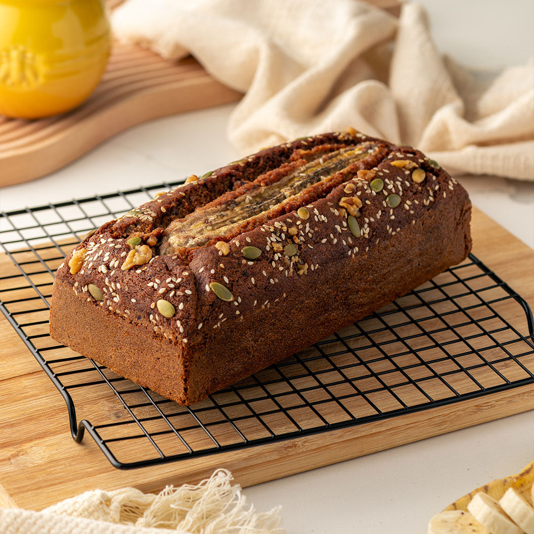 This banana loaf is made with almond meal, rice flour, brown sugar, mixed nuts and honey. It's best served warm, with butter and honey.